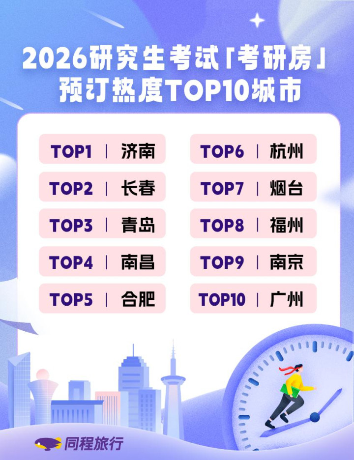 12月10日,2026全国研究生招生考试准考证开放打印。随着考点和考场等考试信息正式下发至考生,“考研房”迎来预订高峰。记者从同程旅行平台了解到,12月10日0时至上午10时,“考研订房”板块访问量大幅增长,“考研房”预订热度较9日全天增长超10倍。在2026年研究生考试考研房预订热度TOP10城市中,山东有三市跻身榜单,分别是济南、青岛和烟台,其中济南位列榜首。